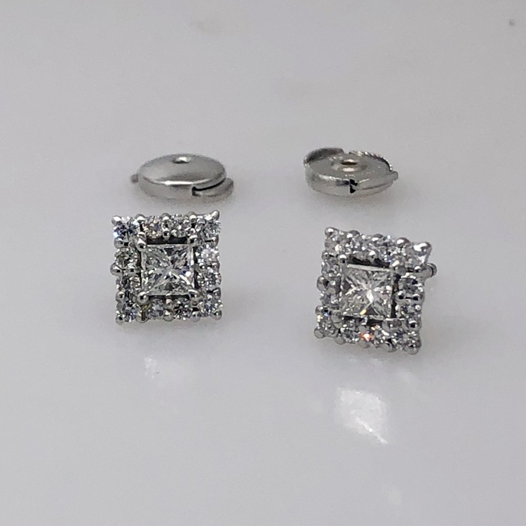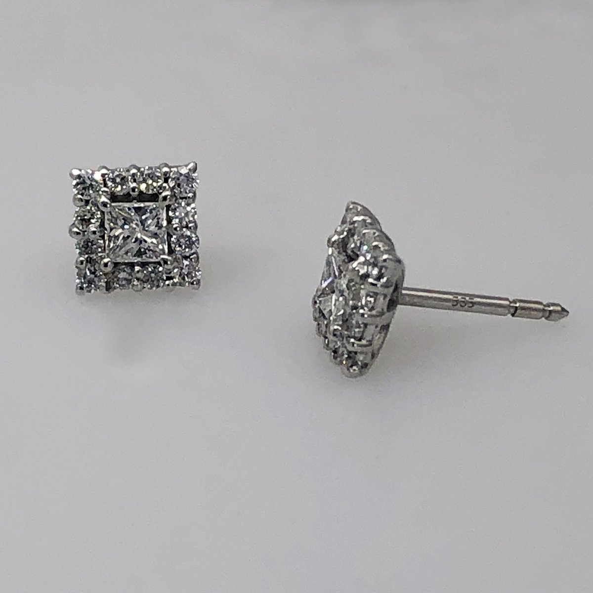 Square and round cut diamonds are set in this cluster with a square halo around the center diamonds.