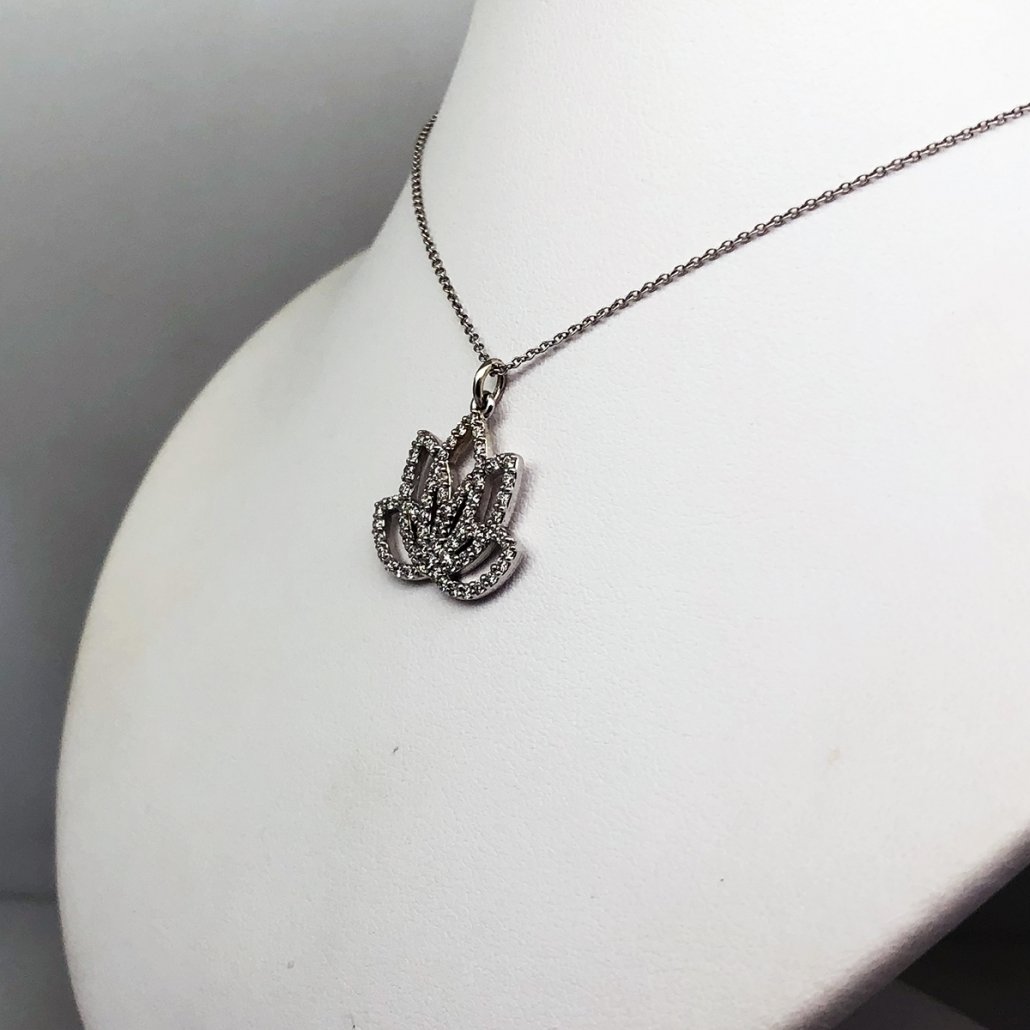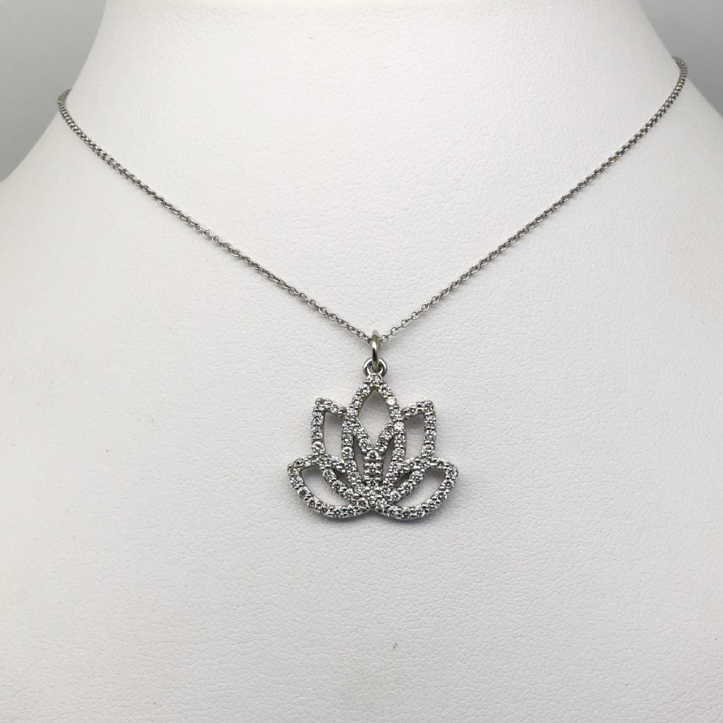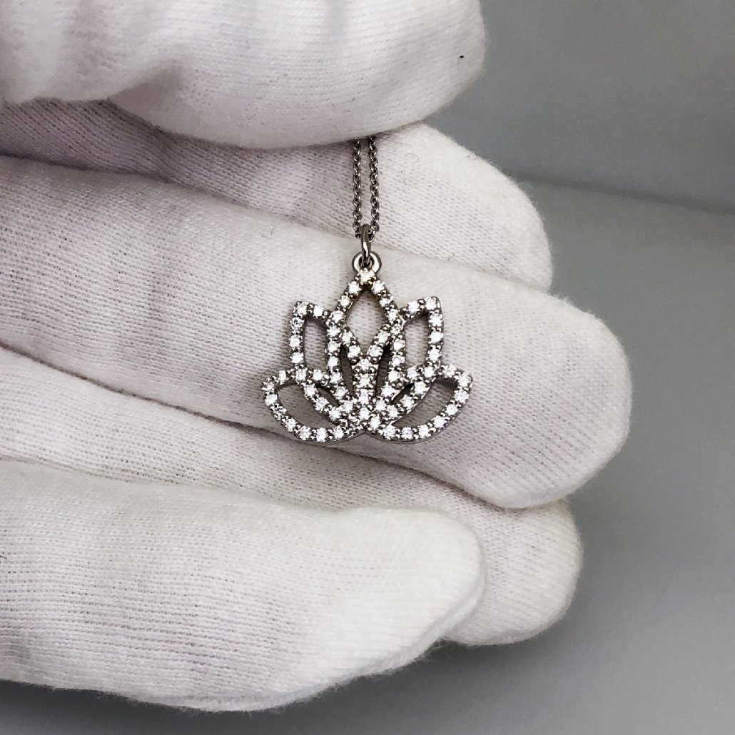 14 K White Gold Lotus Flower Pendant Comprised of 65 Natural Round Diamonds