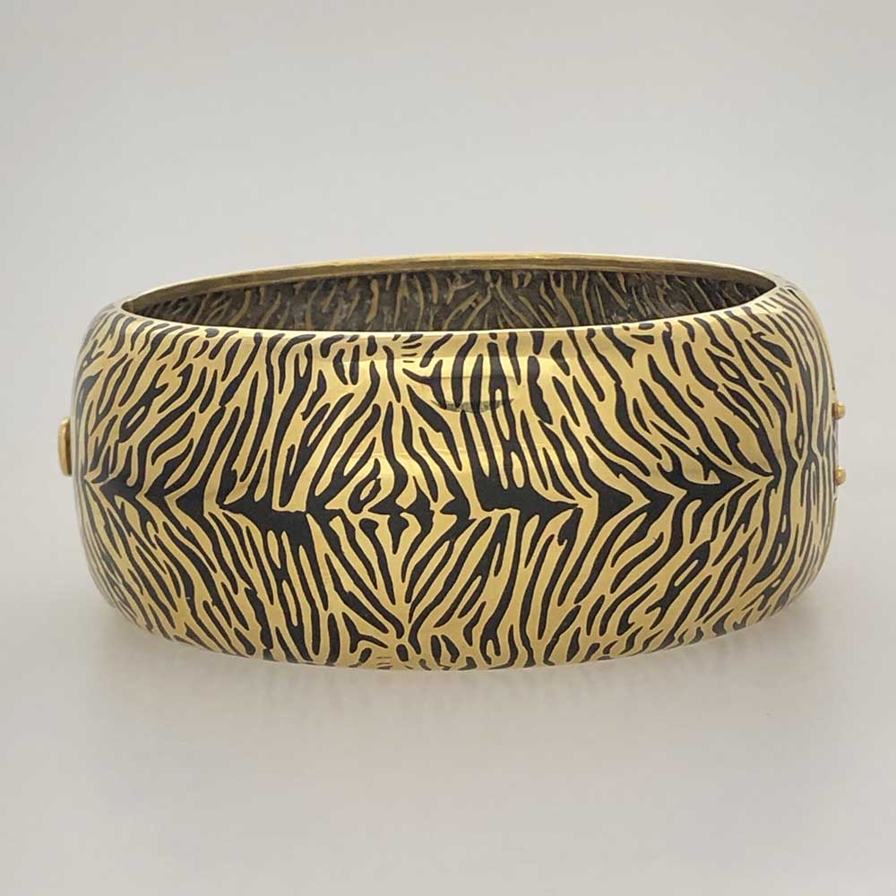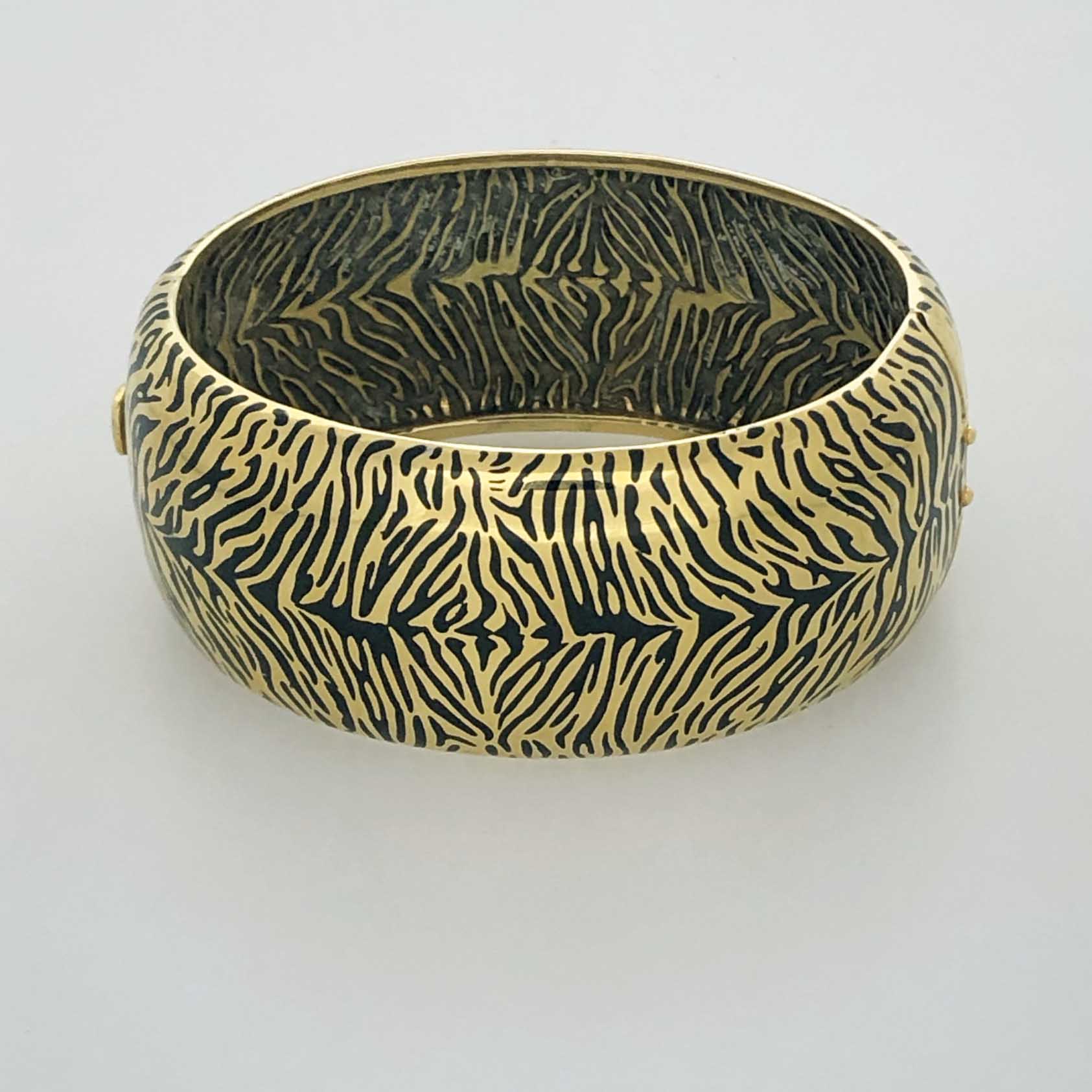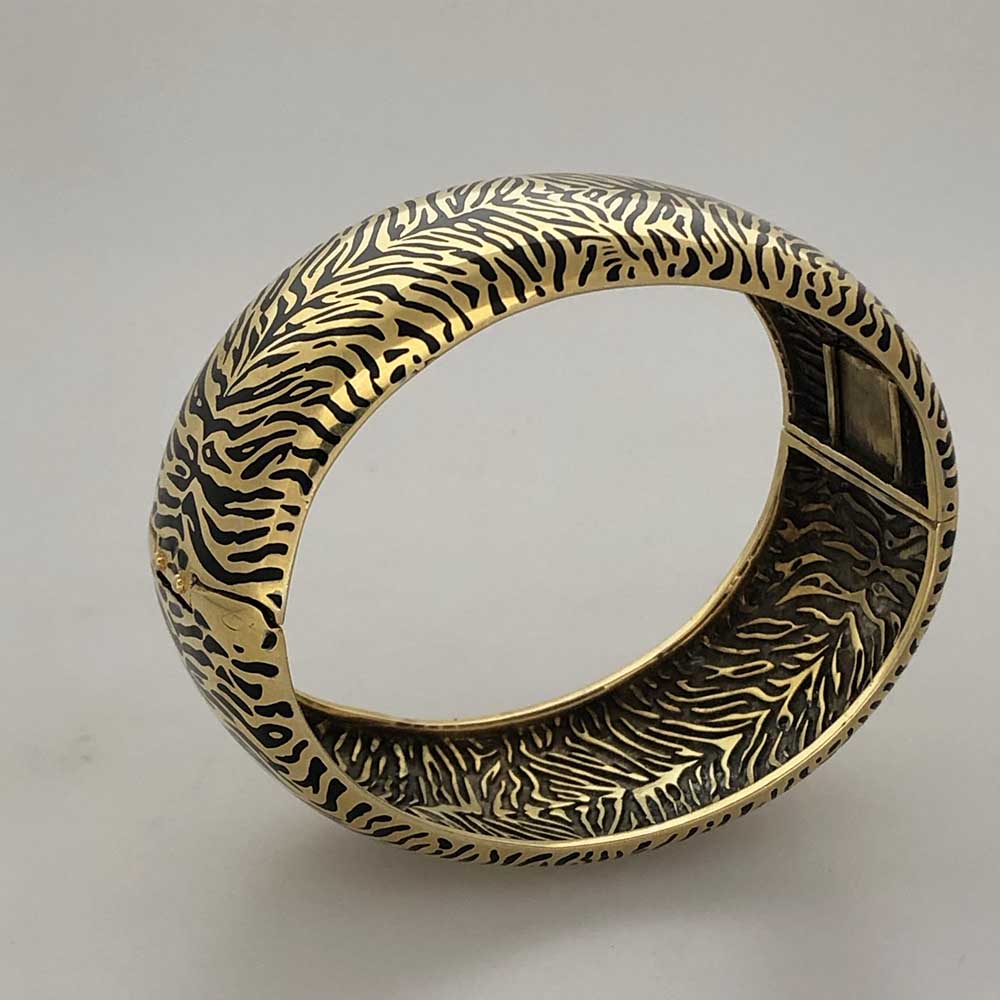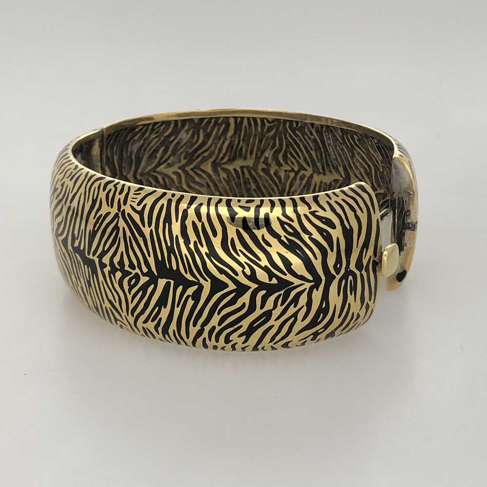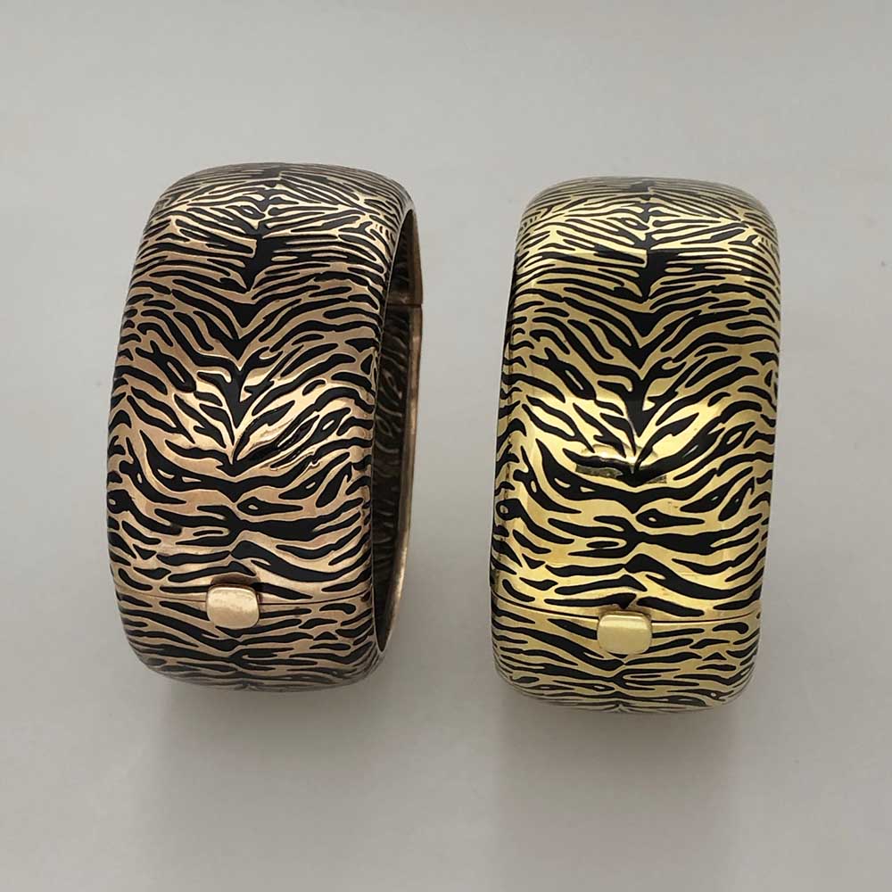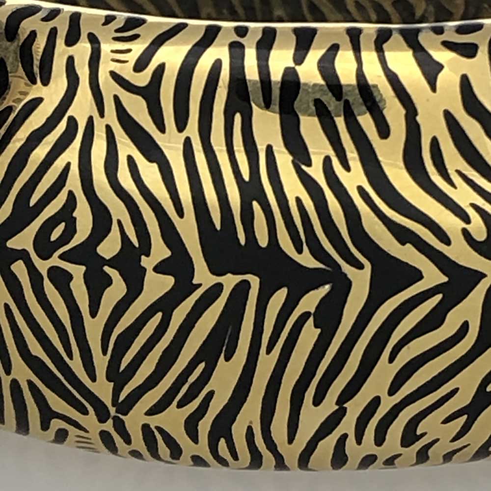 Tags Contemporary Cuff Bracelet, One of A Kind Enamel, One-Of-A-Kind, Pink Gold Over Silver, Tiger Print Enamel Cuff
