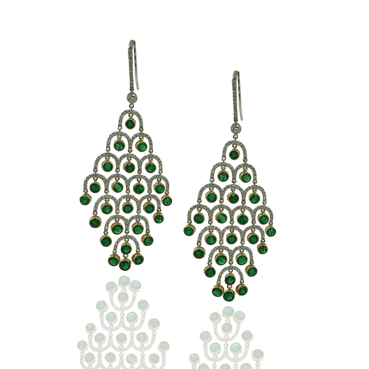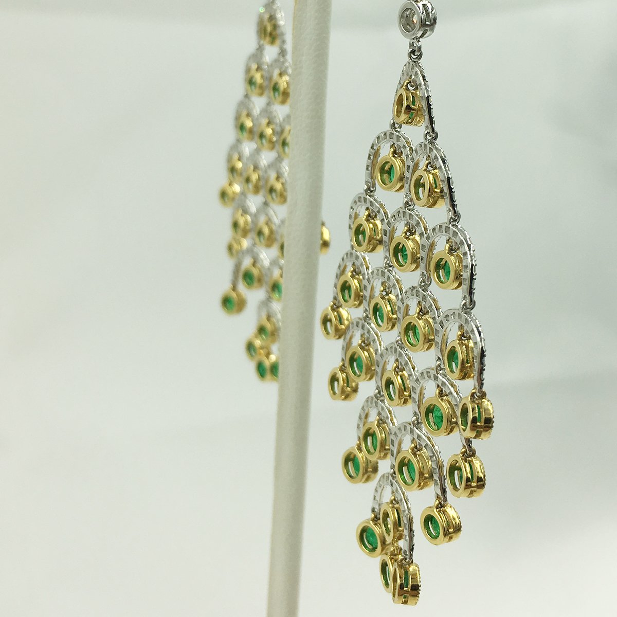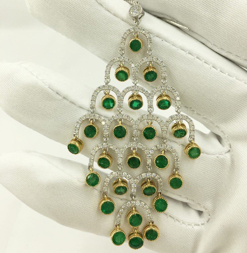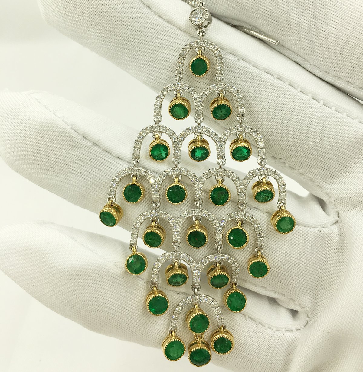Platinum and yellow gold emerald and diamond chandelier earrings. The emeralds are natural rounds and have total weight of 7.19 carats. There are 3.83 carats of diamonds. The emeralds are dangling on links and there are diamonds pave set on the edges.