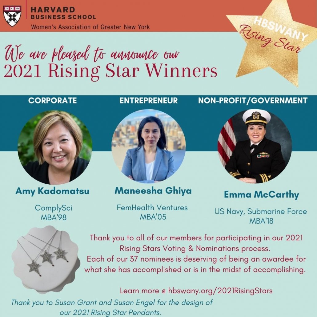 Amy Kadamatsu was recognized as the Corporate Rising Star, Maneesha Ghiya was recognized as the Entrepreneur Rising Star, and Emma McCarthy earned her star in the Non-Profit category.